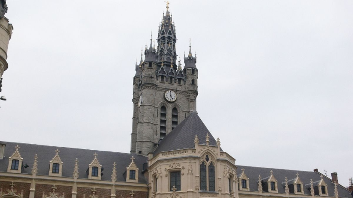 This big square tower made of sandstone is 64 metres high. On the roof, we have lots of turrets and weather vanes flanked by a Flanders lion holding a banner.