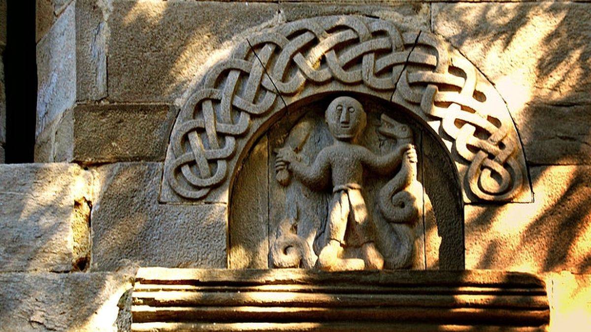 San Quilico is a Romanesque church with pretty rough sculptures: on the Southern tympanum, look at this man wearing a long tunic, a sword in his hand, the other one holding a snake.