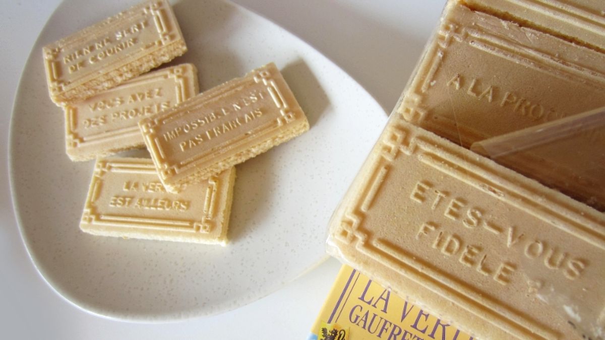 Hey, why ″funny″?? Because on each wafer, there’s a little humorous message, like: T'es pas cap (″Dare you!″) or Tous mes vœux de bonheur (″our very best wishes for your happiness″)...